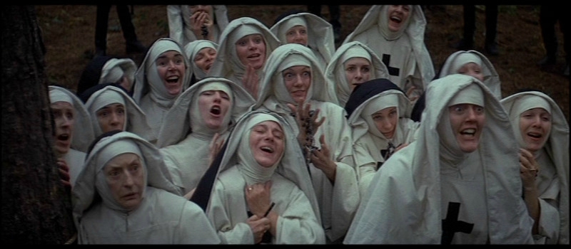At the heart of The Devils is a sexual frenzy. Locked away, monstrous and oppressed, the nuns of the Loudun convent slowly go mad. Their leader, the deformed Sister Jeanne (Vanessa Redgrave), is in love with the charismatic and sexually promiscuous Urbain Grandier (Oliver Reed). Her sexual fantasies about him, loaded with conflicting and contentious Catholic imagery, imagine him half-naked in the public square wearing a crown of thorns. As blood drips from his head onto his chest, Sister Jeanne — at her knees — sensually licks the blood off him. This private moment of ecstasy reveals her urge to covet and destroy the object of her desire.