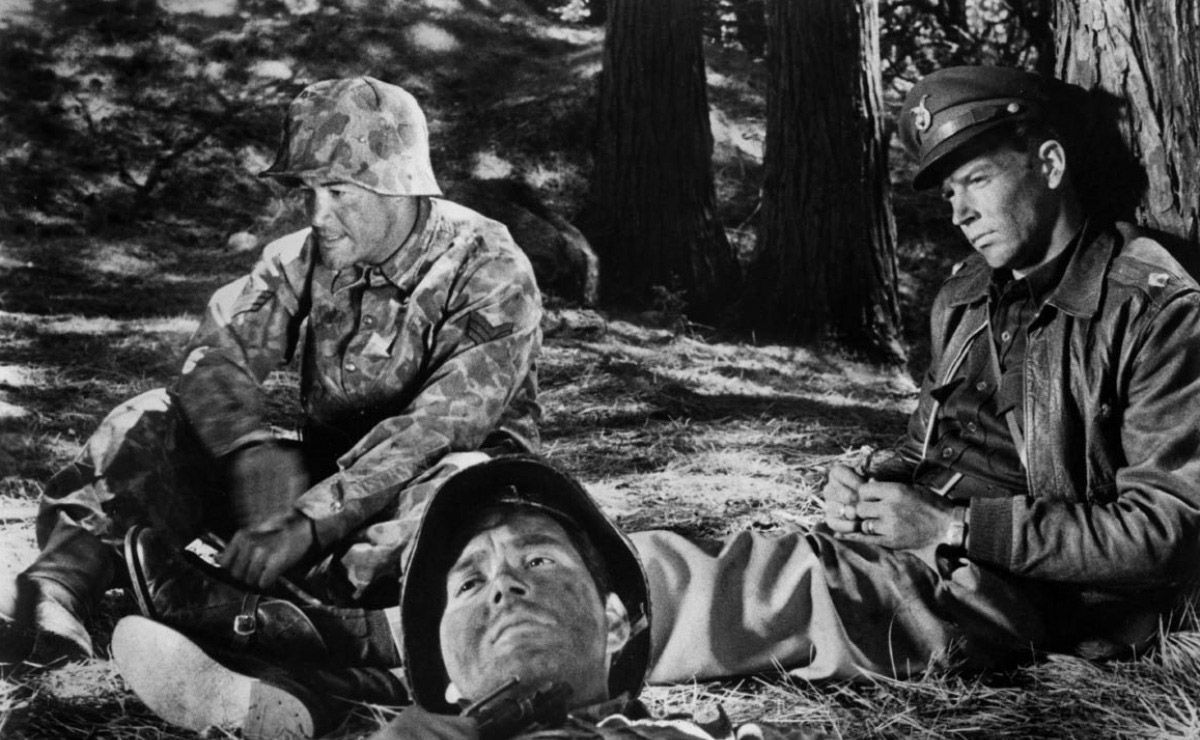 Such contempt also extends to Sidney, who mocks the enemy general (when trying to amuse the captured girl), comically portraying him as pompous, obtuse, and greedy — a caricature of The Man in Charge. In actuality, this general, though the embodied enemy, is as war-weary as the ostensible “good guys.” Shown in the shadows, his head downcast in his folded arms, he broods and muses fatalistic about wartime carnage: “Sometimes I look at these maps and wonder if my own grave isn’t being planned.” The fact that the general and his comrade are also played by Harp and Coit, respectively, suggests the overriding similarities between these dueling forces; no matter the side of opposition, the wages of war weigh heavily on all. A mirrored emotional and physical strain transcends identity and partisan alliance.