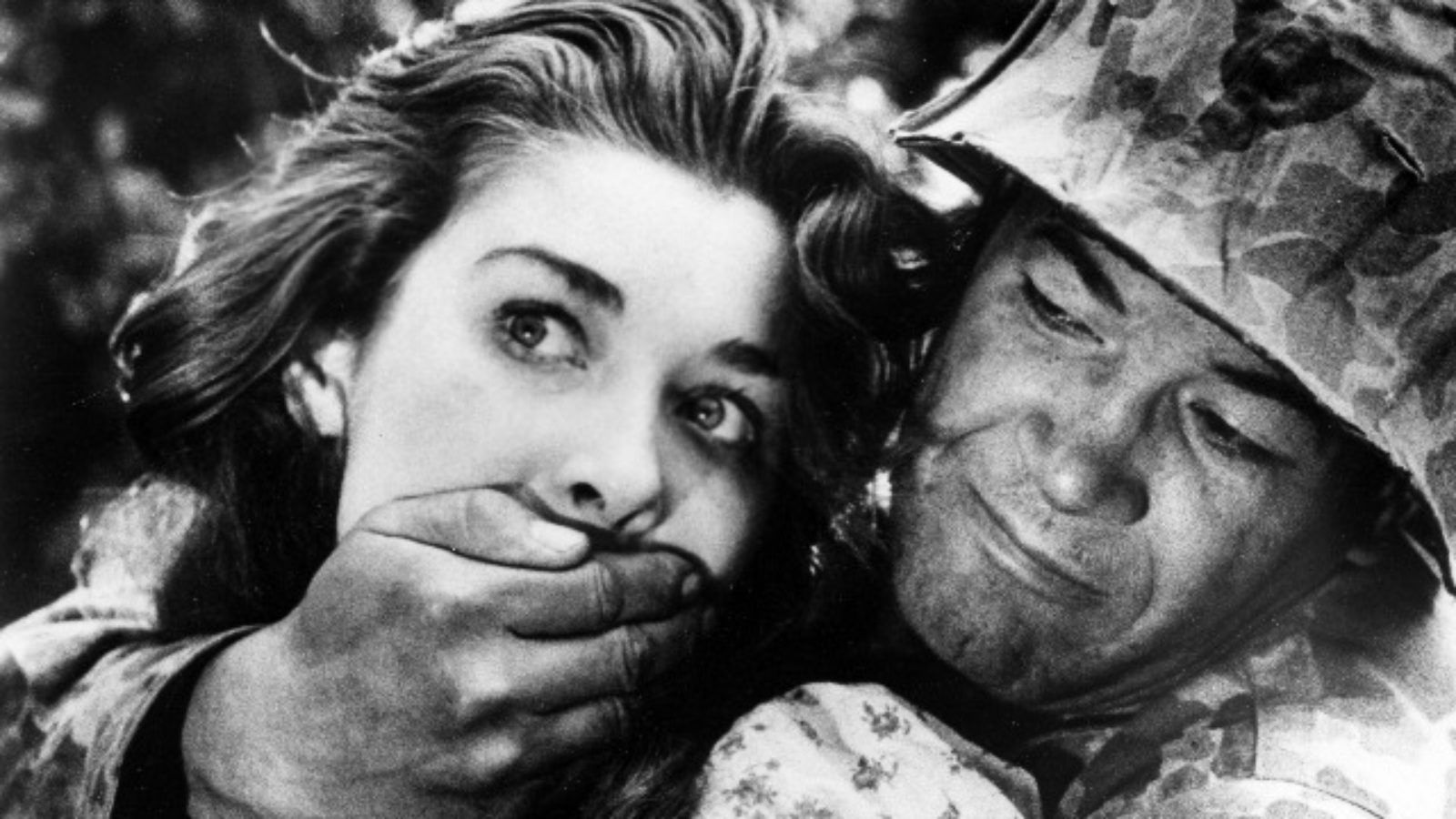 Moving onward, the men happen upon three women by a river, their capacity for wartime decency now facing feminine temptation. Peering through the brush, they observe one young lady in particular as she walks away from the group. They capture the girl, played by Virginia Leith (also her film debut) and tie her to a tree; when Corby lustfully approaches, Mac sarcastically echoes the lieutenant’s own words about remaining civilized. As the other three men tend to their getaway, Sidney is left in charge of their detainee, which proves a disastrous decision. His playful jesting, done to put her at ease, instead devolves into an erratic, unnerving display, culminating in a twisted psychosexual confrontation. By comparison, the girl remains calm, cool and collected. Even when her mouth is uncovered, she does not scream. In fact, she barely struggles. She assesses her situation with an even temperament and remarkable restraint. A seemingly good-natured kid (and clearly scared), Sidney almost instantly becomes even more frightened and paranoid at the thought of the men leaving him behind. What starts as a reasonable fear turns to irrational insanity. Shot by Kubrick through intense close-ups emphasizing a distortion of normalcy, Sidney’s collapse is astonishing. He rambles incomprehensibly; he threatens one moment, pleads with the girl to like him the next. Shell-shocked like those in the trenches of Paths of Glory, the war has become too much for the boy and his discipline is devastated. When Mac arrives to find Sidney lying face down in the muck, mumbling and rambling about blood in the river and other illustrative significations of his breakdown, he flatly, accurately, concludes, “He’s gone out of his head.”