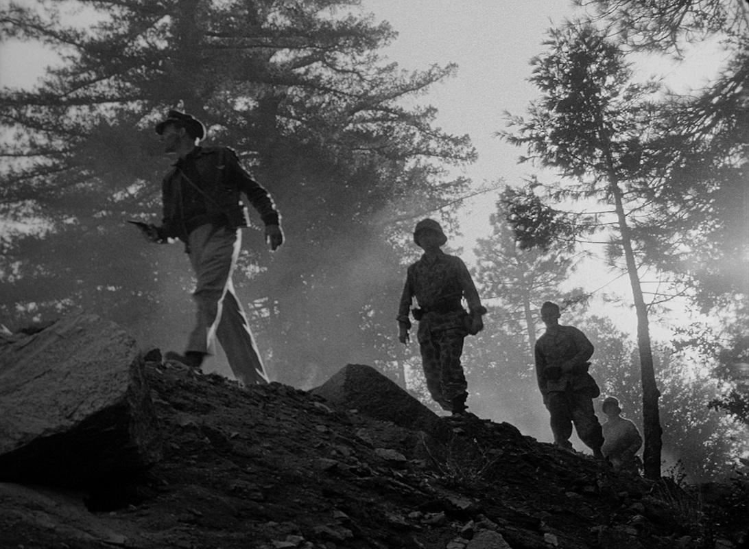 Kubrick’s acute photographic eye, honed since the age of 17 during his tenure at Look Magazine, soaks up the sun-kissed greenery of this undefined forest setting, the pleasantness betraying the danger (Corby jokingly comments that there is nothing like an afternoon outdoors in enemy territory). But thematically, the environment is also key. As Kubrick amply creates an atmosphere of apprehension, with a prevailing sense of powerlessness, the men literally try to regulate their surroundings. Using the cover of foliage to conceal themselves, taking the natural habitat and manipulating its features for the purpose of camouflage as well as a makeshift raft, their resourcefulness combats the initial helplessness and instead gives them the controlling upper hand in which the hostile environment is swayed in their favor.