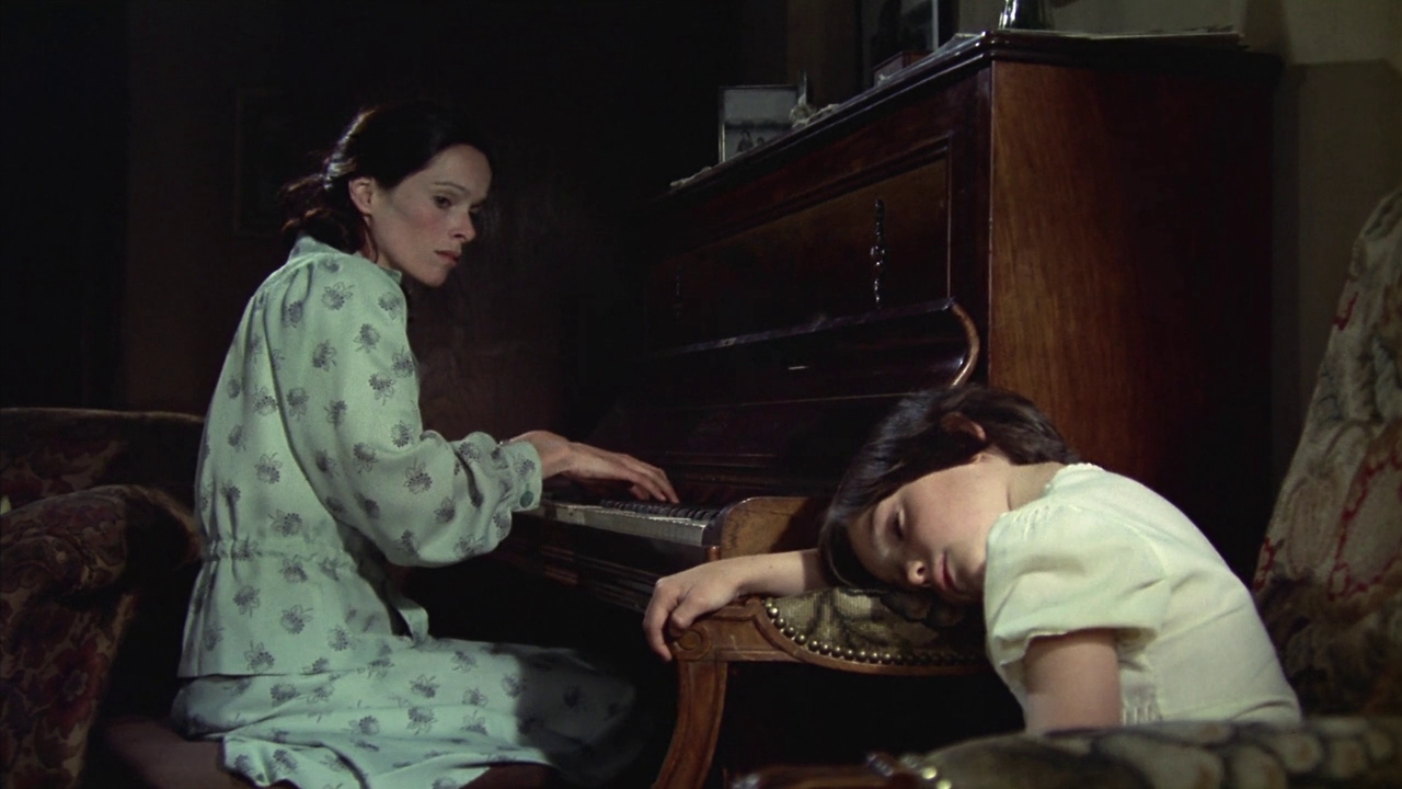 As Cría cuervos begins, Ana bears acoustic witness to her womanizing father, Anselmo (Héctor Alterio), a senior Army officer, as he audibly dies in the midst of a vociferous lovemaking session with, as it turns out, the wife of a family friend. Once Anselmo passes, the woman, Amelia (Mirta Miller), flees as she attempts to get dressed, only to reappear at his funeral, much to the young Ana’s puzzlement. Ana’s mother, Maria (Geraldine Chaplin), has already died, but her spectral presence remains. In fact, save for the arresting dance sequence, it is only at the ethereal sight of her deceased mother that a smile breaks through Ana’s robotic trance. The warmth and tenderness conveyed in these illusory moments of elation make the loss that much more tragic.