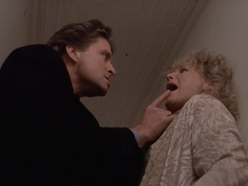 Following his affair with Alex, Dan is consumed by fear — first of being found out and then of being killed. While Lyne employs every trick in the book to present Alex as dangerously insane, he also revels in how Dan’s soon-justified paranoia makes him look ever more pathetic and ridiculous: again, it’s the source of the film’s ambiguity and much of its comedy as well. Finally returning home after his weekend with Alex and just before Beth’s return, a panicked Dan is shown quickly getting into bed, then jumping out of it, only to make it seem like he slept in it. Later, every time a phone ringing threatens to get Beth talking to Alex, the camera focuses on Douglas’ anxious face and the editing elongates his suspense, to then have it dissipate ridiculously: he fails all attempts at discretion when he drops a heavy piece of furniture he was moving to answer the call, which is coming from his secretary rather than the “other woman.” Dan is as ridiculous and weak as Alex is crazy and dangerous.