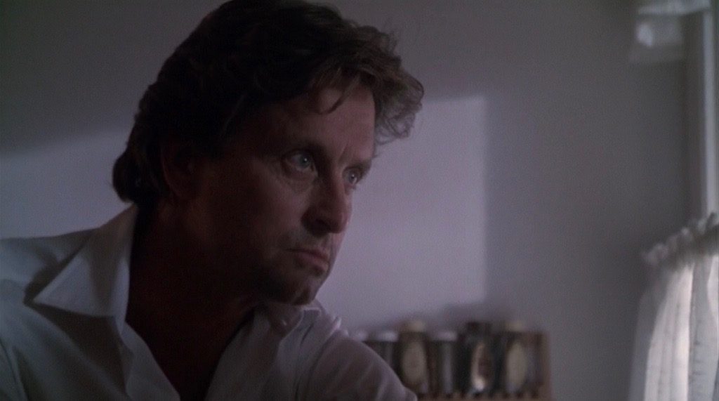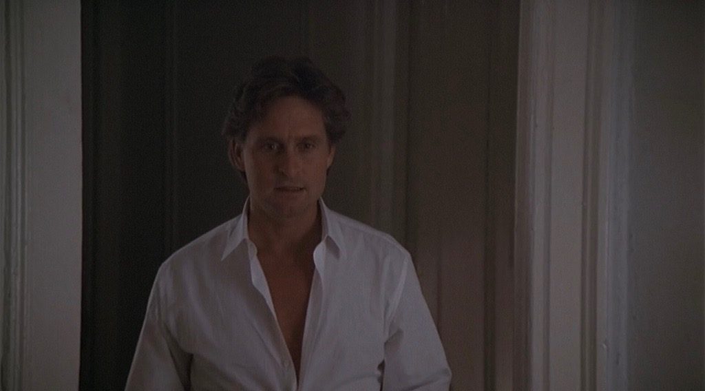 Lyne emphasizes Douglas’ Everyman quality from the start. When Dan first appears, he is sitting beside his daughter Ellen, working overtime with his headphones on while she laughs at a silly show on TV; in the bathroom, beautiful, ever-smiling Beth is getting ready for a couple’s night out. It’s a seductive image of domestic life, but the details keep tarnishing the perfect surface — and Dan’s place within it. When he goes to answer the phone, Dan stubs his toe because the living is messy with toys. He has to ask his wife where she put his suit because her clothes are hanging everywhere to dry; although in good spirits, everyone is in a rush, and Douglas’ eyerolls and sincere yet tired smiles show a quiet and resigned frustration.