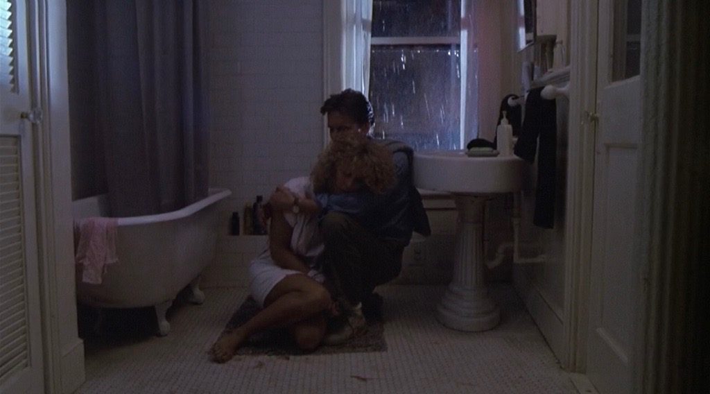Fatal Attraction was famously re-written in the editing room; the ending that was eventually chosen for the theatrical release finds Lyne bringing Dan and Alex closer together while simultaneously distancing himself (and the audience) from them, subjecting both to generic humiliation while placing a third character on a pedestal. Reduced to hysterics, Alex finds her way into Dan’s apartment while Beth is having a shower, and advances on her (she’s gone Psycho). Even though Dan eventually hears Beth’s screams and suffocates Alex in the bathtub, it is Beth who successfully kills Alex when the lovelorn, white-eyed woman surprisingly rises again from the waters, brandishing her knife. Now armed with a gun, Beth shoots her just once in the heart, with an expression of pain and determination on her face.