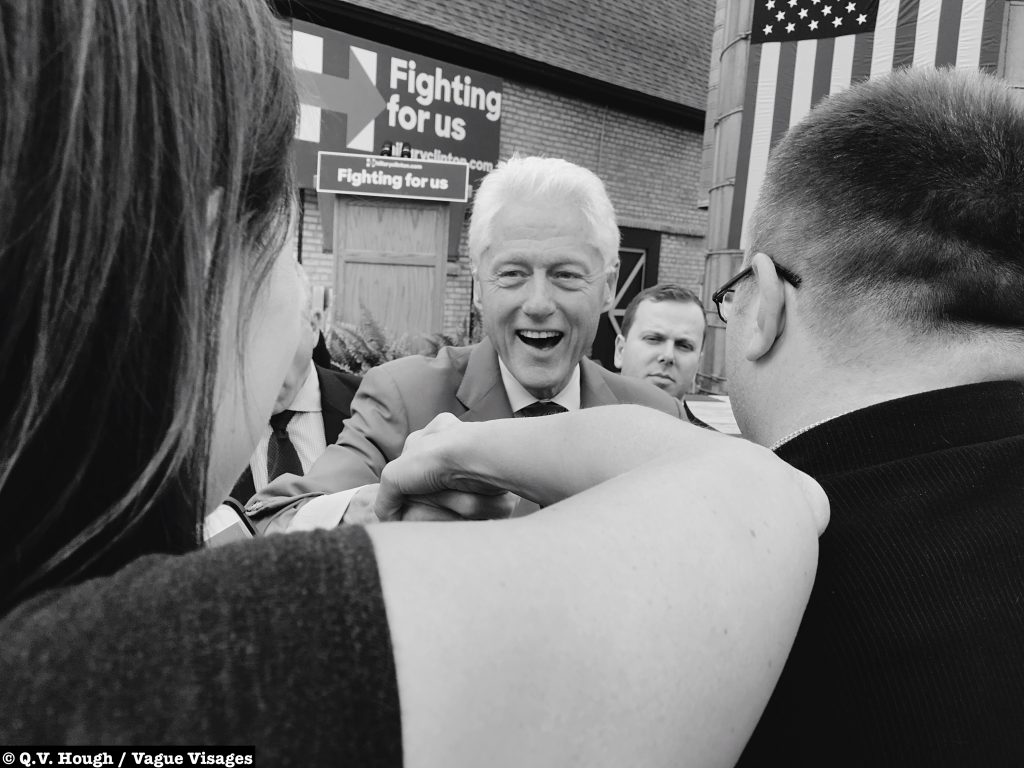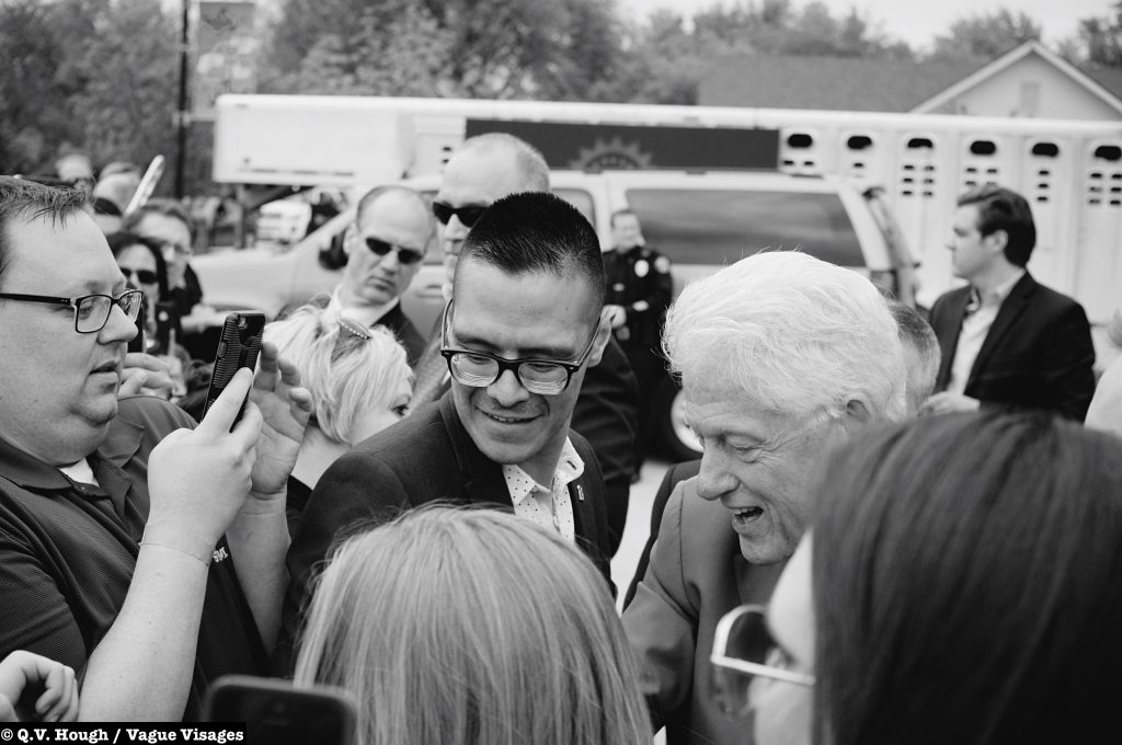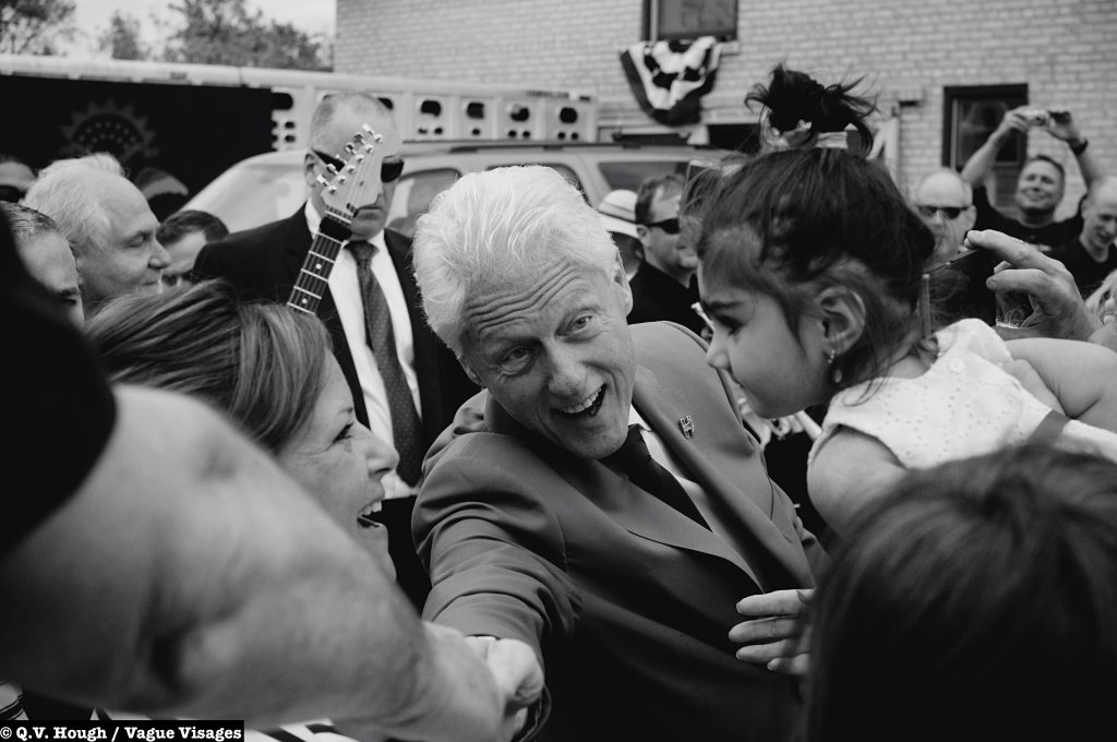When the gate finally opens, nobody checks my bag. Nobody asks any questions. I look around and survey the crowd. Hmm. This doesn’t necessarily feel safe, but it does feel like South Fargo. It feels like a community, a round up of 25th Street and 32nd Avenue locals. A band fires up some old school Motown, the photogs find their places and I strategically make my way to the stage. Easy money. Lots of bodies pushin’ back and forth, though — passive/aggressive power moves and friendly words. By now, I’m sweating and it will only get worse. The band plays another song. The Secret Service emerges. Suddenly, the afternoon transforms from a joyous gathering to something much more powerful. Kids scream. The elders adjust their glasses. And who are these people on stage? After the guest speakers hype up the featured guest, Bill Clinton finally emerges and observes the sweat-stained yet enthusiastic crowd.