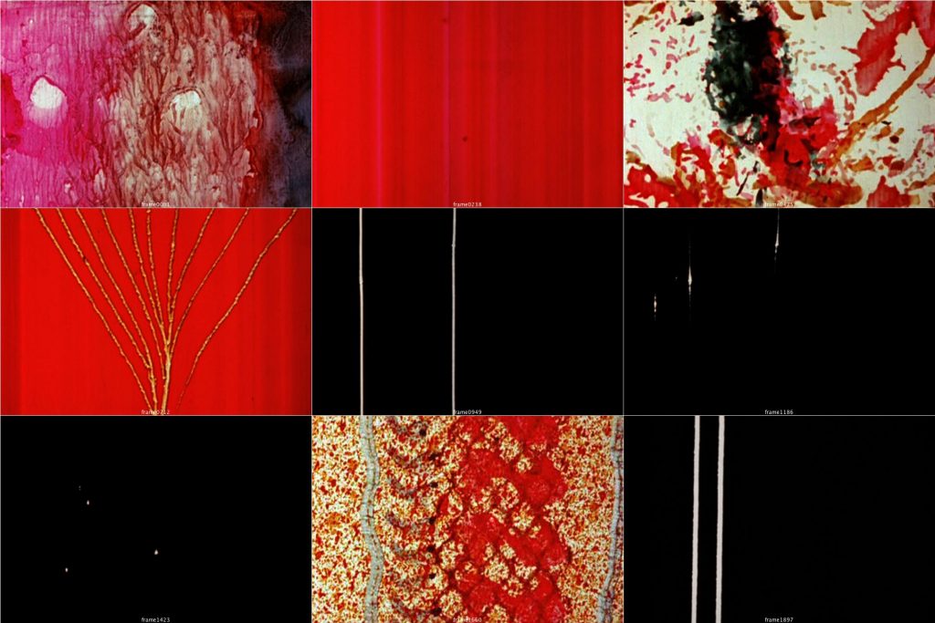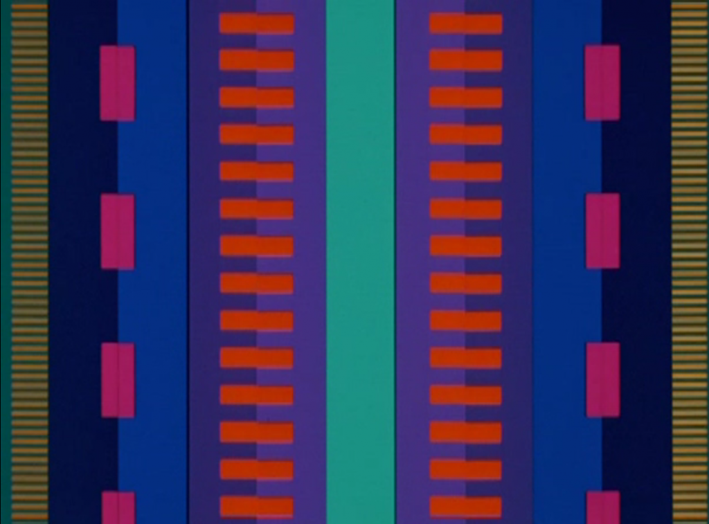 As well as visualising recorded music, McLaren experimented in “optical sound” — the process of drawing on the audio part of a film strip, so that original sounds can be generated in the same manner as the drawn visuals. These experiments culminated in Synchromy (1971), the most audacious and perfectly formed of McLaren’s films. It comprises shots of cards, the various sizes of which affect pitch and volume. The same cards are photographed onto the soundtrack strip of the film reel and onto the frame itself, so that sound and image are exactly reflective of one another. They are put together to create a melody, so that essentially McLaren is using the film material as a musical instrument. This is the sound/image experiment at its “purest” — there is no separation between the two, because one could not exist without the other.