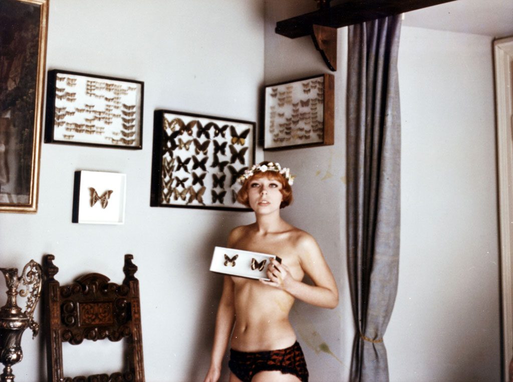 The Maries’ mastery over the audience is no less intense. Extravagance fills every frame, from exorbitant amounts of food and drink, to intricate butterfly display cases, to multicolored streamers and flower crowns. Chytilová’s radiant display is seductive, and deliberately so; through the beguiling images she’s quietly appealing to our intrusive gaze. It’s a flirtatious tactic, akin to the way the sisters lure and taunt their innumerable suitors. Of course, there’s also a sexual component to the appeal: the Maries’ nakedness, suggestive posing and handling of genitalia-shaped objects introduce an erotic lens by which viewers can access and consume their performance.
