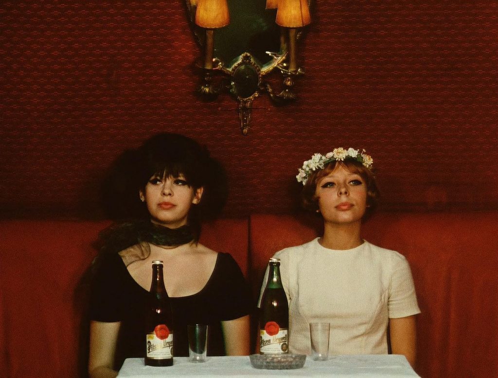 The opening titles of Daisies, Věra Chytilová’s Czech New Wave allegorical reverie, overlay a jarring juxtaposition of images: bomb explosions and grinding machinery gears. The sound of hardware carries over as the picture cuts to two flower children sprawled against a fence in floral bikinis. Stony-faced and staring into the camera, the women make awkward, robotic gestures accompanied by synchronized mechanical sounds — Mickey Mousing as deadpan cyborgs. Viewers soon learn that the duo, who may or may not be real sisters, go by the names Marie I and Marie II. Inviting a voyeuristic gaze, the Maries are pleasure givers and receivers, indulging throughout the film in an excess of food, drink and luxury while the audience revels in the lovely and leisure-filled mise-en-scène. The Maries, and Daisies itself, are quintessential fruits of the Czech New Wave, deconstructing social hierarchies while embodying the free-flowing, iconoclastic ethos that roused and buoyed 1960s Czechoslovak cinema.