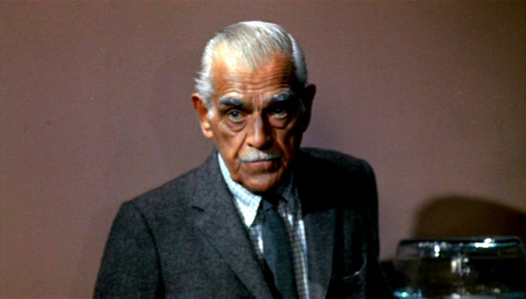 If Lugosi seems to appear as himself in the final moments of Mark of the Vampire, then Boris Karloff one-ups his occasional on-screen partner by playing a version of himself for the entirety of Peter Bogdanovich’s 1968 film Targets. Karloff plays Byron Orlok (presumably a reference to the count in Nosferatu), an ageing horror star who decides to retire after completing his final film, The Terror — a real film that stars Boris Karloff, directed by Roger Corman, and released in 1963. Throughout Targets, there are references to Karloff’s career. In one sequence, Byron and Sammy (who directed Byron in The Terror, and is played by Bogdanovich) watch some scenes from The Criminal Code, a 1931 film that, along with Frankenstein that same year, served to help Karloff break through as a performer.