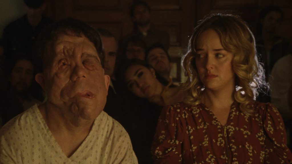 A small film crew, helmed by a German director (Charlie Korsmo, the child actor from Hook) making his American debut, stages an art-horror movie set in a hospital with a cast that includes disfigured people. Young Mabel (Jess Weixler), toiling in less-than-stellar projects beforehand, hopes this film will be her big break. Starring opposite her is Rosenthal (Adam Pearson), a man with neurofibromatosis. The social dynamic is uneasy between them at first, but they gradually form a close bond over the course of the film shoot. And amid the comings and goings of the various crew members, happening in the larger world, and reported on local televised news reports, is a series of crimes committed by a man with facial wounds, creating a low-level unease to the film’s proceedings.