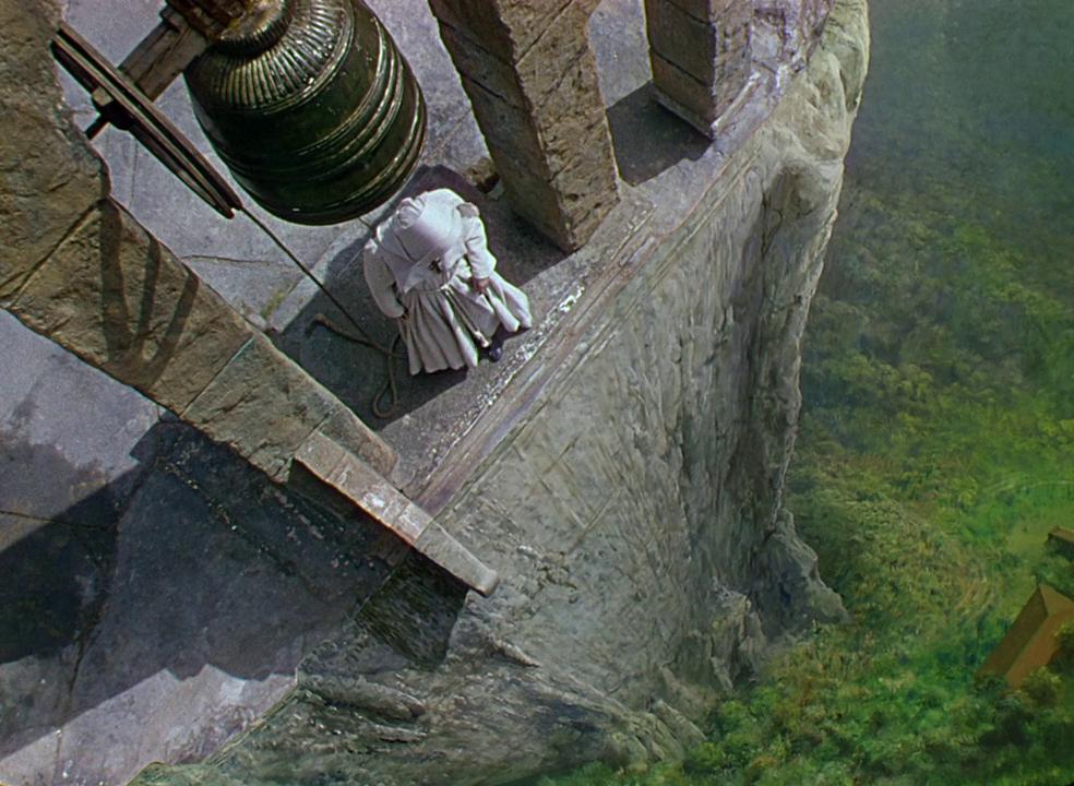 Art director Alfred Junge made visual differentiations between groups of characters. Nuns wore only off-white and minimal makeup. Mopu natives wear a variety of different colors, or — in the General’s (Sabu) case — they’re dressed in stark white and adorned in furs and jewels. Even Kanchi (Jean Simmons) is a visual counterpoint to the nuns with her nose ring and thick eye makeup. Kanchi is more in tune with physical pleasures, being the only one who enjoys Narcisse Noir — or Black Narcissus, the namesake of the film — a parfum the General found at the British Army-Navy store and shows to the nuns. Like Mr. Dean, Kanchi presents an air of temptation. When the young General arrives, he wants to be taken under the educational care of the convent, learning languages and arithmetic. However, he rejects their teachings, including that of Jesus Christ of which he is interested, to run off with Kanchi and embrace his heritage.
