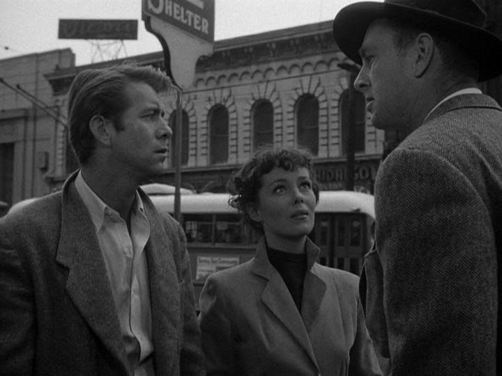 Pitfall stars Dick Powell as insurance investigator Johnny Forbes. He’s a litany of complaints about his boring and regimented life. His wife Sue (Jane Wyatt) could probably list a few grievances of her own, but she’s an adult and a mother. She deflects her husband’s whining with amused sarcasm, no doubt practiced after years of raising their young son, Tommy (Jimmy Hunt). It seems boys take a while to grow up.