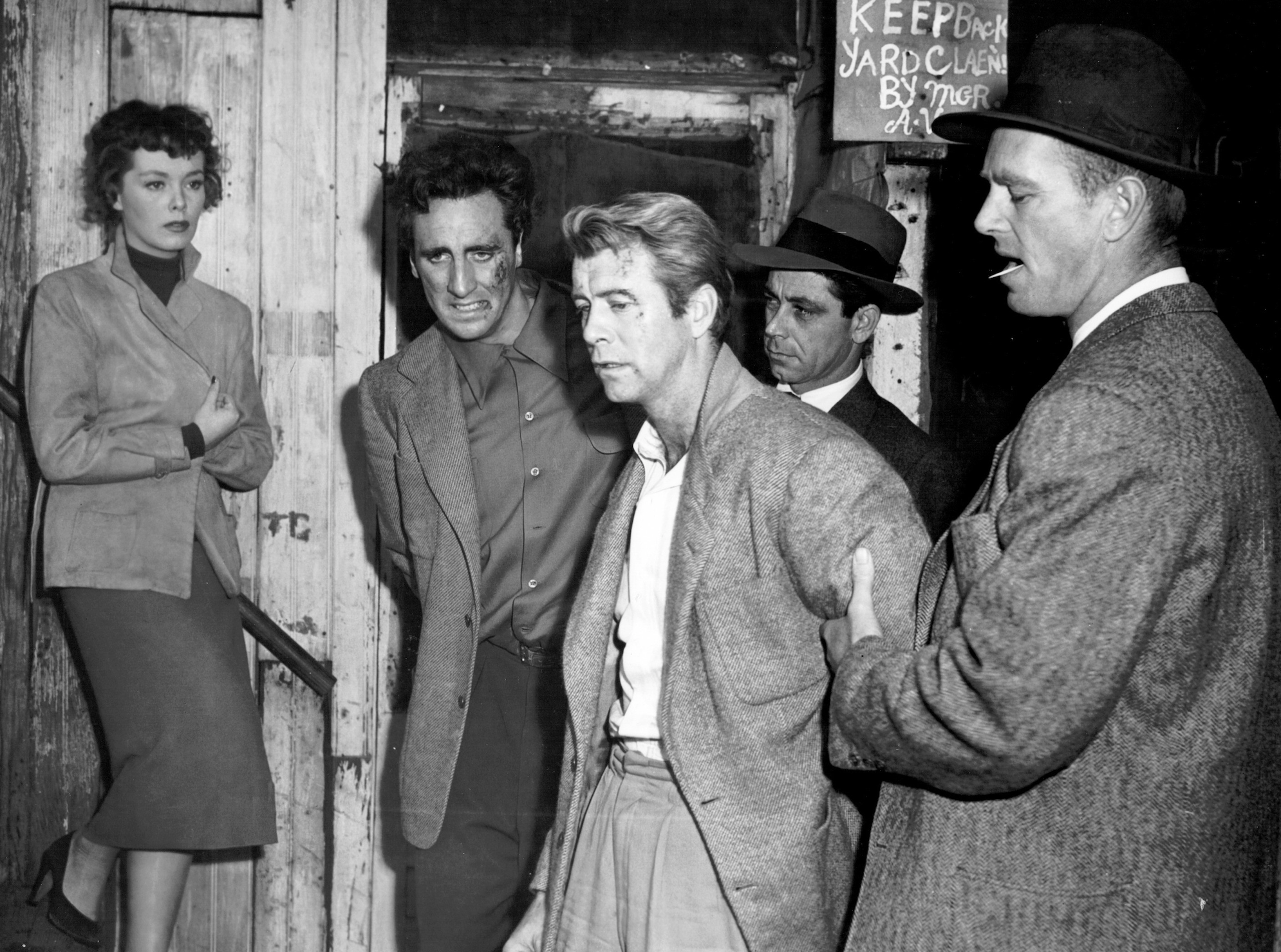Not only is Ellen determined to keep her man from getting roped back into crime, she’s equally determined to defend him against the hard-ass L.A. detective Lt. Sims (Sterling Hayden) intent on proving Lacey has rejoined his old gang. (Crime Wave is the very definition of “between a rock and a hard place.”) Once a crook, always a crook, Sims believes, and spends the film riding Lacey in the hope he’ll slip and give him an excuse to end his parole.
