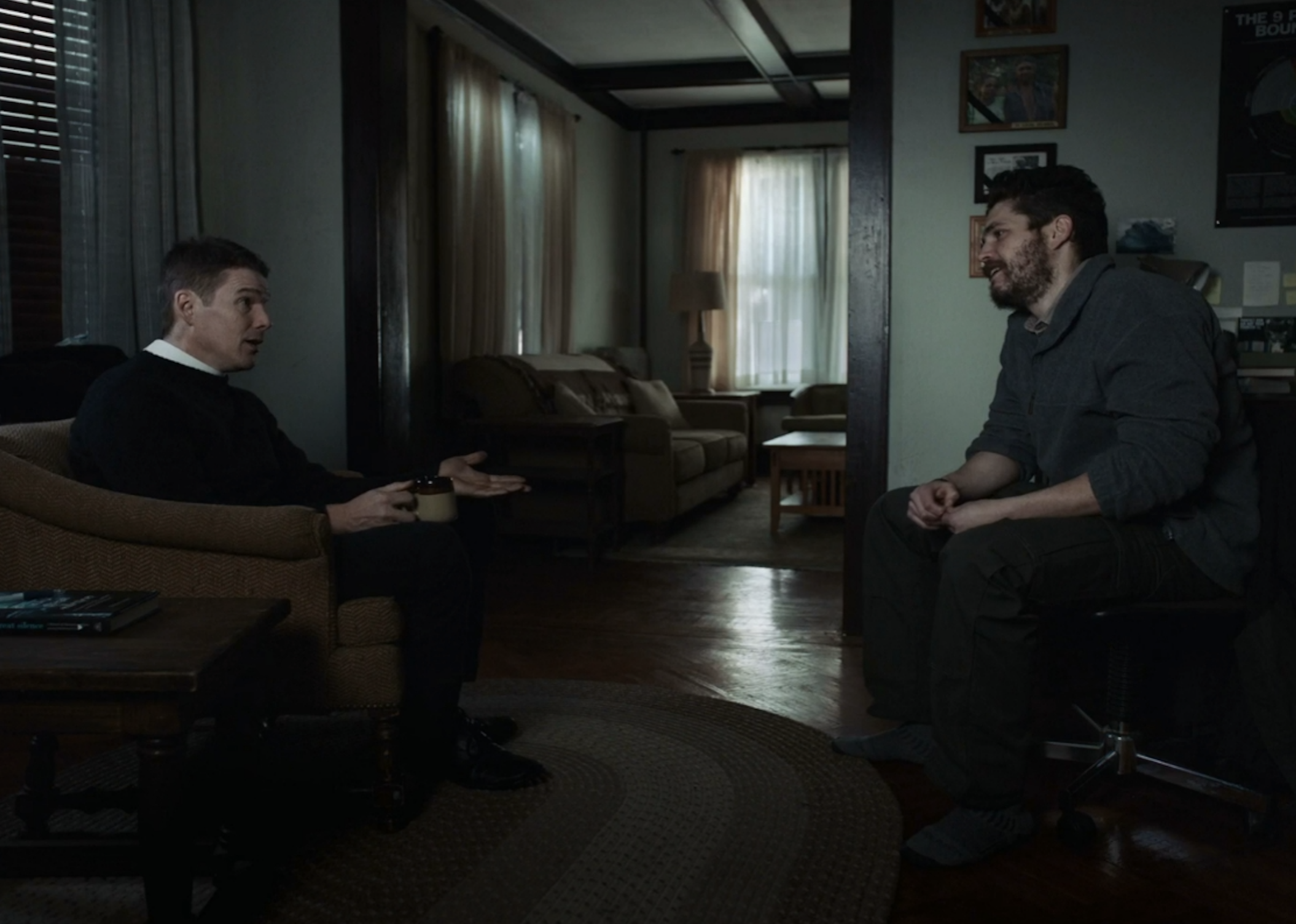 In practice, First Reformed makes good on the theoretical framework that Schrader lays out in his book, which he recognized in the films of Ozu, Bresson and Dreyer. Throughout the movie, Schrader minimizes the use of showy visual techniques to such a degree that he eliminates even over-the-shoulder coverage of dialogue. Characters do not enter one another’s close-ups; they are restricted to their own, often shot straight on in flat compositions that are emphasized even further by Schrader’s decision to shoot in the 1.33:1 Academy ratio, making the frame square instead of a sweeping widescreen aspect ratio. The camera itself moves only a handful of times throughout the film. Its first shot dollies towards the eponymous church, a historic white building in upstate New York. One move is a slow push in on Toller in a crucial moment, making a close-up even closer. Another subtly tracks to the right to follow a pair of characters from a house’s front porch to its driveway, where they head for the garage. The startling lack of camera movement draws attention to each individual shot, and the accumulated effect offers a stark contrast to the dominant visual style of cinema in 2018, frames filled with visual noise, edits coming fast and furious.