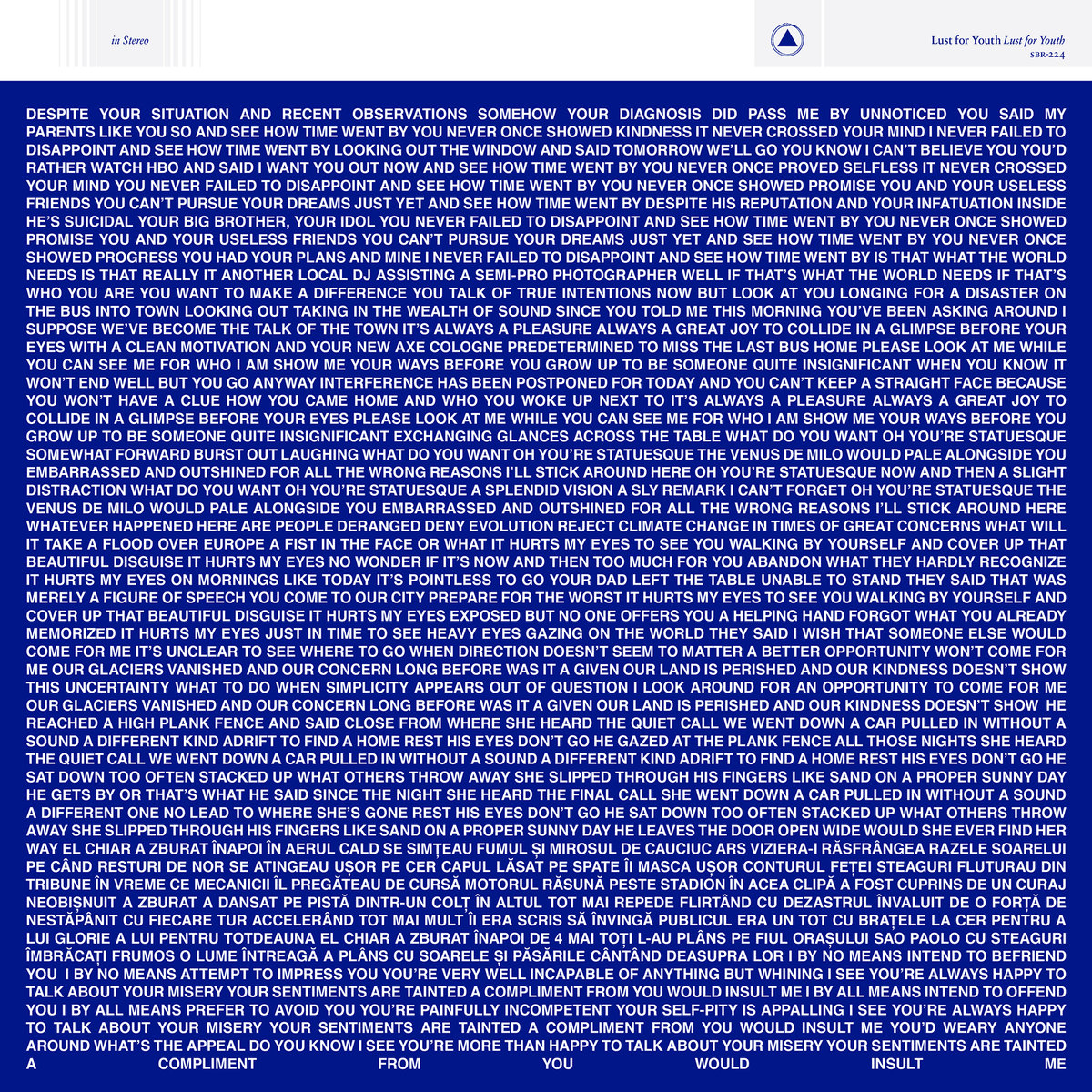 Things shift gears a bit with the spoken word “Imola.” The track’s hypnotic minimalist melody verges on late period Japan while an unnamed female speaks softly in Romanian about the final race (and death) of Brazilian Ayrton Senna da Silva at the 1994 San Marino Grand Prix. It’s a spectacular achievement in both form and content and begs for more Lust for Youth sonic experiments in this vein.