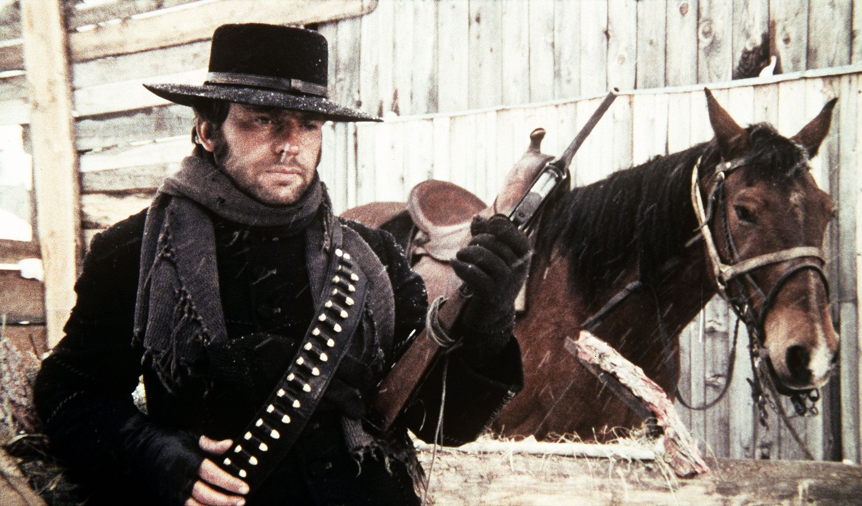 Shot on location in the Italian Dolomites, where a rumored 26 tons of shaving cream formed the snowbanks of the film’s backdrop, The Great Silence was meant to echo certain “Snow Westerns” of decades prior, like André de Toth’s 1959 film Day of the Outlaw (while previewing Robert Altman’s similarly transgressive McCabe & Mrs. Miller, from 1971). There, amongst the howling winds and billowing blizzards, faces grow worn by the weather and by years of ruthless living. The accumulating blankets of snow also prove beneficial to someone like Loco, who uses the frosty groundcover to keep weapons hidden and bodies buried, kept “fresh” until they can be tendered for reward. Such idiosyncrasies were par for the course with Spaghetti Westerns, and to that end, The Great Silence submits quite a few, including the gun carried by its savvy, eponymous crusader, a machine pistol stored in a wooden box holster.