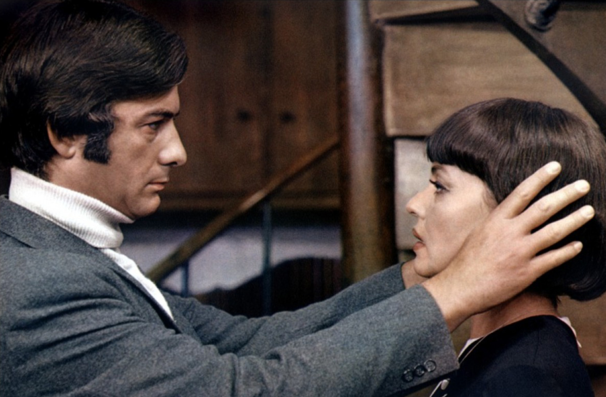 The angel of death quickly finds victim #2, Coral (Michel Bouquet), a weak and insecure romantic who is ecstatic that a female of Julie’s caliber expresses interest in him, and falls easily into the trap of drinking poison set by his “fairy princess.” Wearing a black dress, white cloak and gloves, along with black ribbon in her hair, Julie aptly resembles the Princess of Death in Jean Cocteau’s 1950 film Orphée. Immediately following the murder of Coral, Julie again rides on the train as if it is her chariot of death. This repetitive linearity is reminiscent of Truffaut’s similar technique in Fahrenheit 451 when Montag (Oskar Werner) rides the monorail.