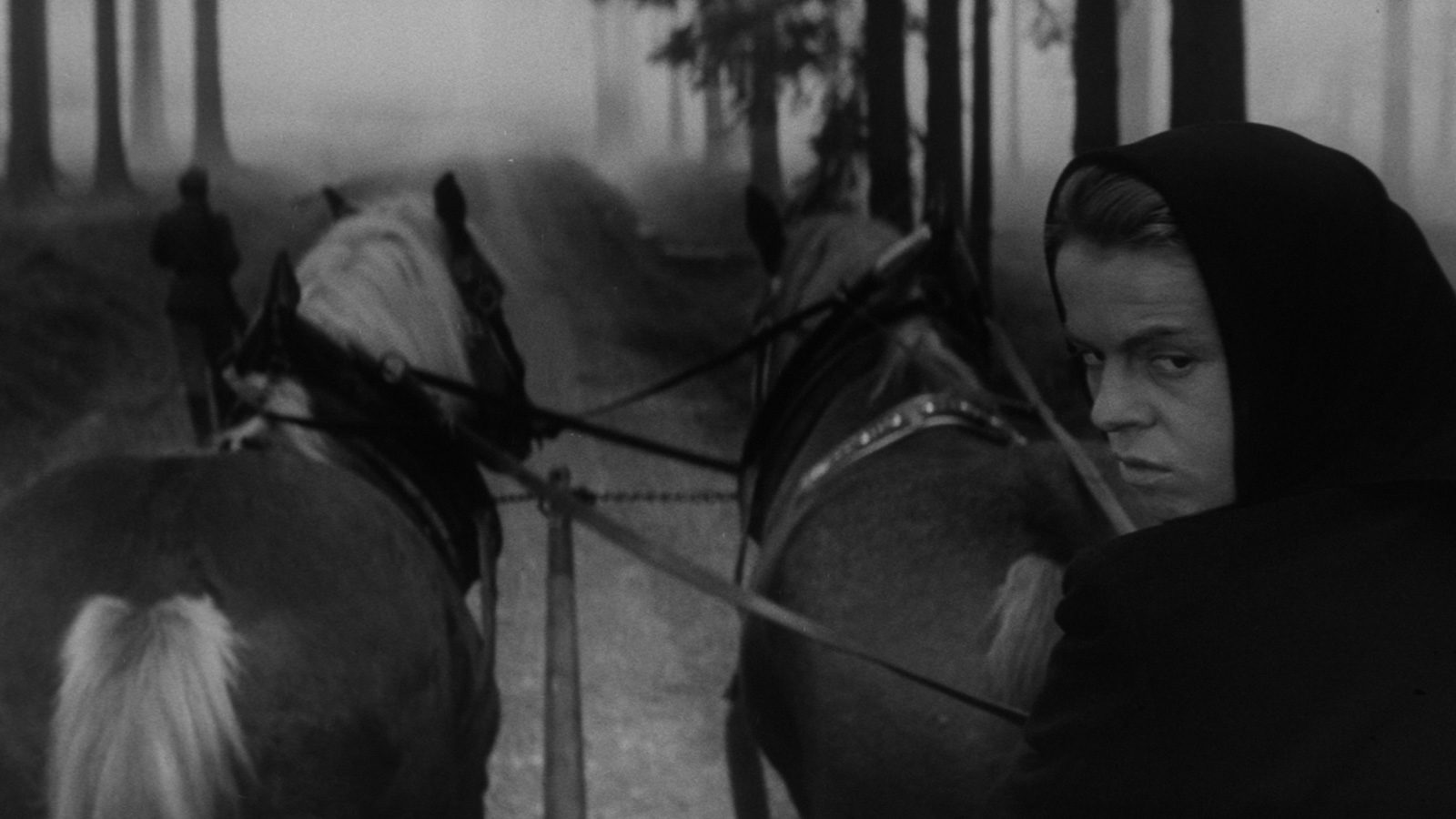 Such a reading is deepened by the mise-en-scène and careful frame composition of Coach to Vienna’s first half. Kachyňa breaks Krista apart from Hans and Gunter (one shot has her riding crop literally splitting the two actors, creating an in-frame shot/reverse shot). Her careful sabotage of the pair’s weapons is depicted silently and visually; Krista stays almost entirely mute for the entire film, except during a strange call she uses to stop the horses, with Kachyňa depicting her transformation in purely visual terms. The widow wears a black shroud that creates a barrier between her and the rest of the world, like a wraith.