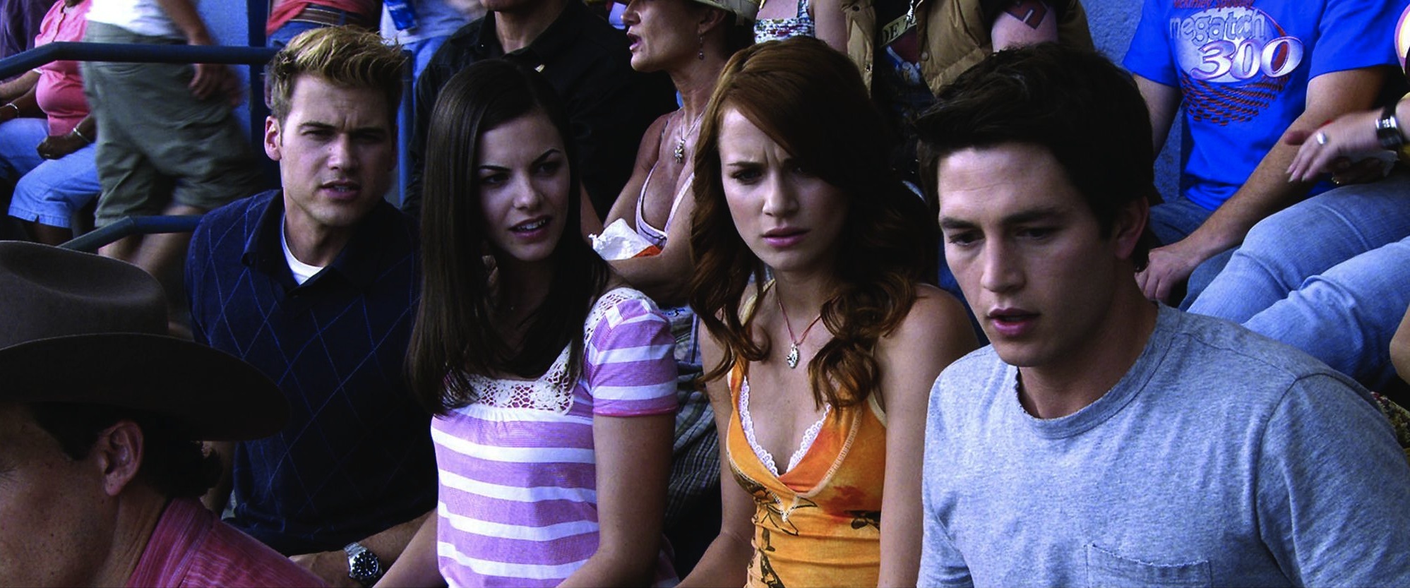- “Devour” by Shinedown (00:00:00): The Final Destination soundtrack song scores the opening sequence. Nick attends an auto race event with Lori and their friends. Janet (Haley Webb) says, “Tell me again why we chose this over seeing the movie.”